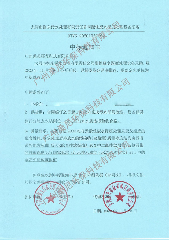廣州桑尼環(huán)保科技有限公司參與酸性廢水深度處理設(shè)備采購(gòu)項(xiàng)目投標(biāo),以良好的信譽(yù)、豐富的經(jīng)驗(yàn)、強(qiáng)大的技術(shù)實(shí)力以及專業(yè)的方案、合理的報(bào)價(jià)贏得了招標(biāo)單位以及評(píng)標(biāo)專家的肯定,成功中標(biāo)。