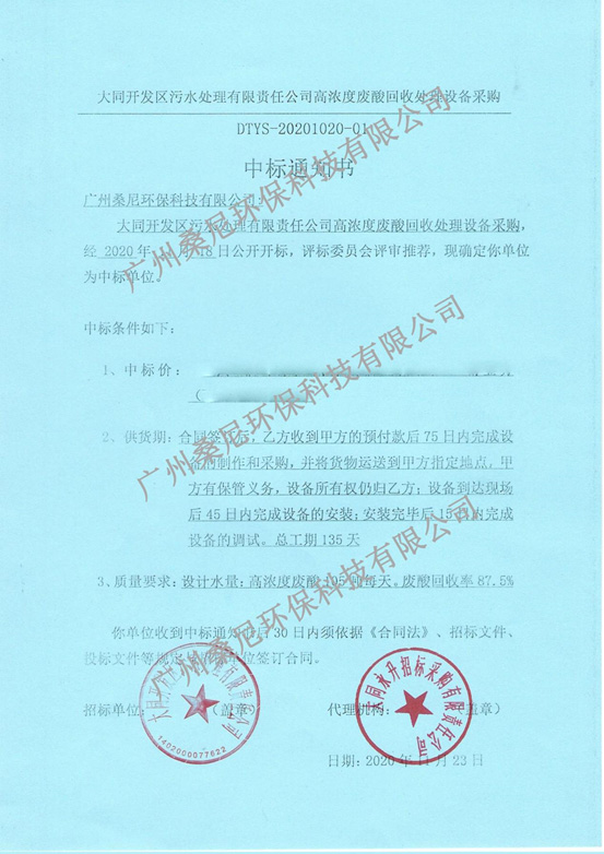 廣州桑尼環(huán)??萍加邢薰境晒χ袠?biāo)高濃度廢酸回收處理設(shè)備采購(gòu)項(xiàng)目以良好的信譽(yù)、豐富的經(jīng)驗(yàn)、強(qiáng)大的技術(shù)實(shí)力以及專業(yè)的方案、合理的報(bào)價(jià)贏得了招標(biāo)單位以及評(píng)標(biāo)專家的肯定,成功中標(biāo)。