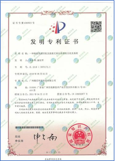 2021年5月再添2項授權(quán)發(fā)明專利--炸藥生產(chǎn)廢水的預(yù)處理方法及其處理系統(tǒng)(專利號:ZL 201711117309.9)、一種鉻泥資源回收及廢渣無害化處理的方法及系統(tǒng)(專利號:CN201810876172.3)。?